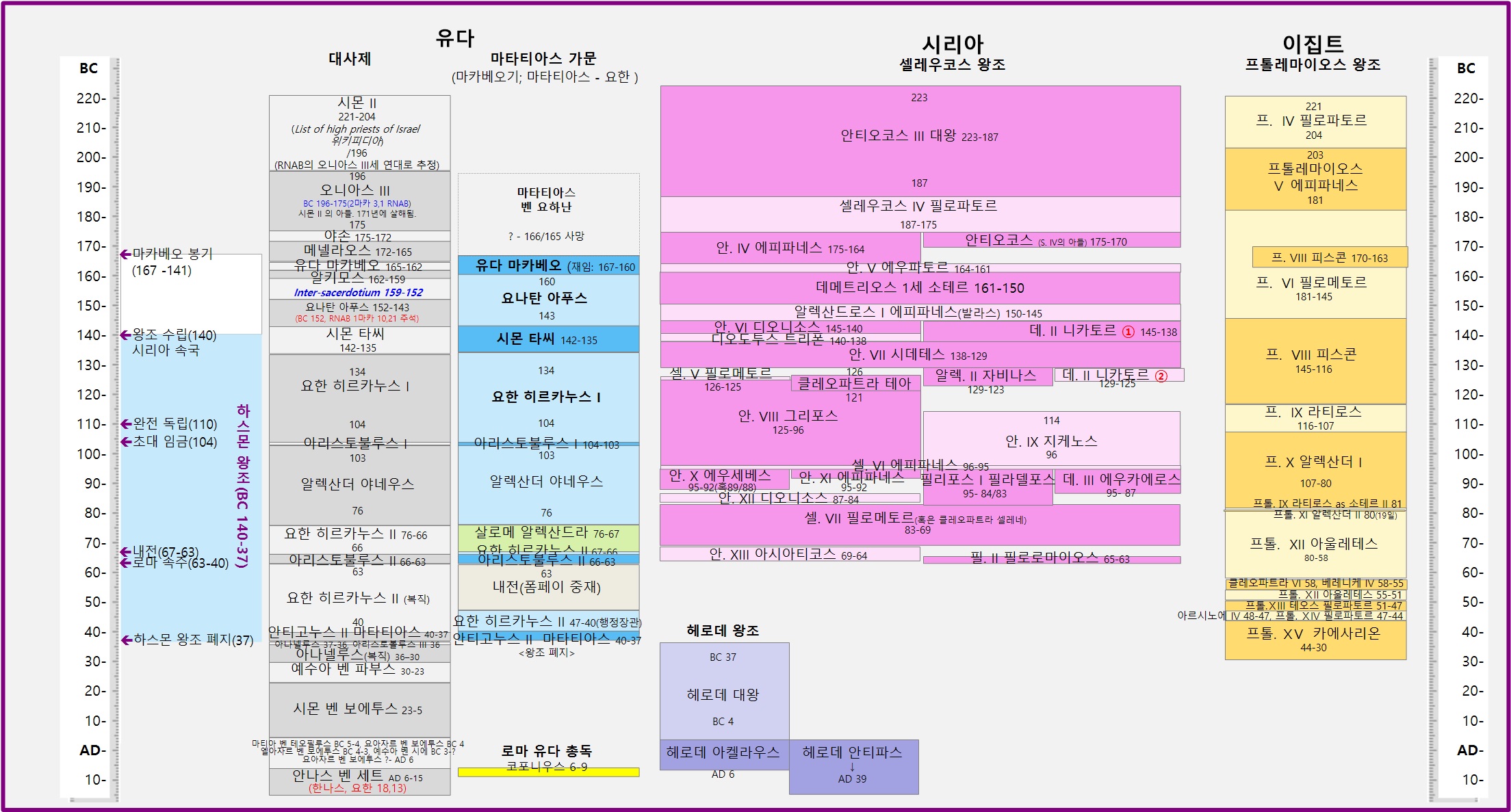 | 7셀레우코스가 생을 마감하고 에피파네스라고 하는 안티오코스가 왕좌를 이어받았을 때 [▶BC 175-164년], 오니아스의 동생 야손이 부정한 방법으로 대사제직을 차지하였다.(2마카 4,7) 에피파네스가 즉위한 연도는 BC 175년이다. 그러므로 2마카 4,23절의 세 해 뒤는 BC 172년에 해당한다. |