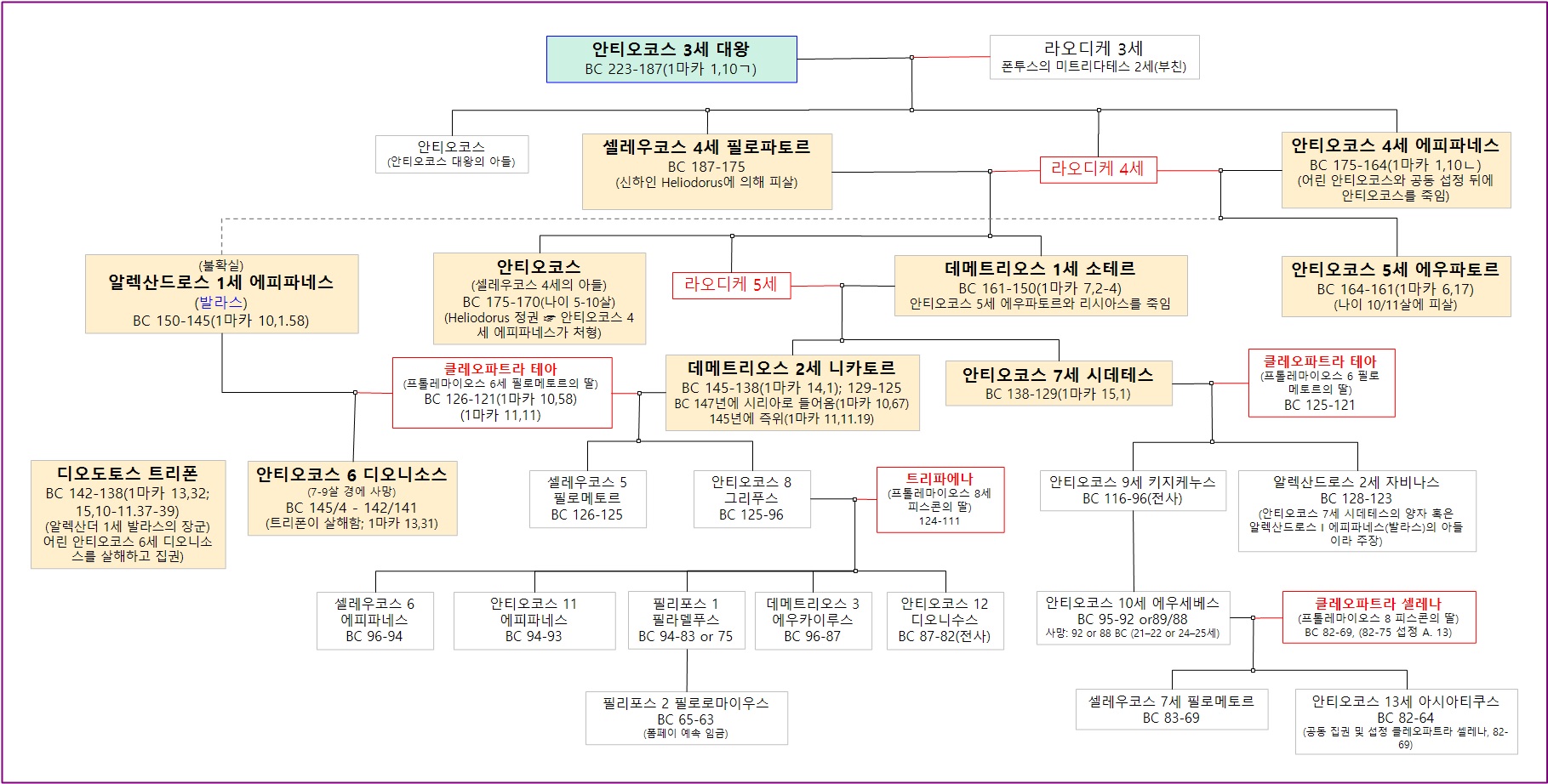 마카베오기 시대의 지도,관련 국가 및 인물에 대한 연대표,비인륜적인 가계를 형성한 왕조의 가계도,마카베오기의 본문의 연도별 주요 상황, 그리고 그와 관련 인물들에 대한 연대표를 게재한