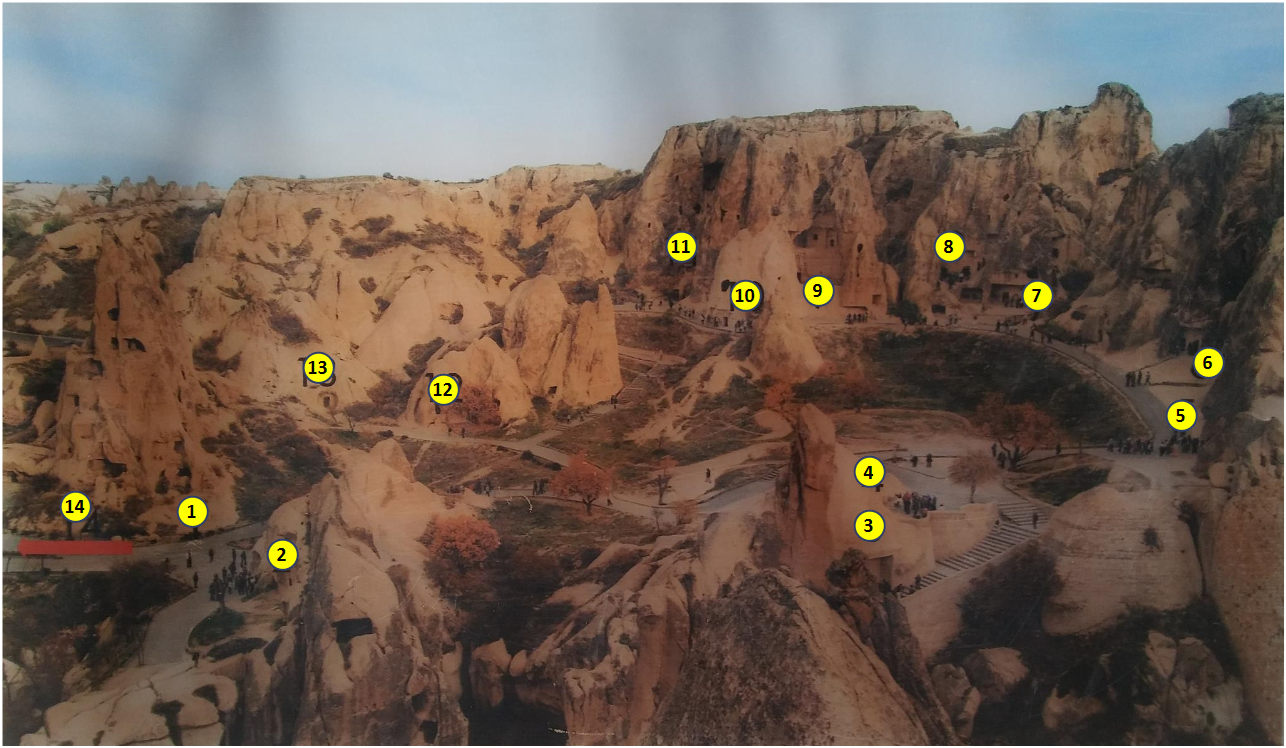 | 1. 수녀원 [Nun monastery] 2. 성 바실리우스 성당 [St. Basil church] 3. 엘말리(사과) 성당 [Elmali(Apple) church] 4. 성 바르바라 경당 [St. Barbara chapel] 5. 성 오누프리우스(뱀) 성당 [St. Onuphrius(Snake) church] 6. 팬토크레터 성당 [Pantocrator church(팬토크레터: 우주의 지배자로서의 그리스도를 표현한 그림)] 7. 휴게소 [Refectory] 8. 말테세 십자가 성당 [Maltese cross church] 9. 칼란리크(어둠) 성당 [Karanlik(Dark) church] 10. 성 카타리나 경당 [St. Catherine chapel] 11. 카리클리(샌들) 성당 [Carikli(Sandal) church] 12. Unnamed chapel [무명 경당] 13. Graves [묘소] 14. 코칼리(버클) 성당 [Tokali(Buckle) church] |