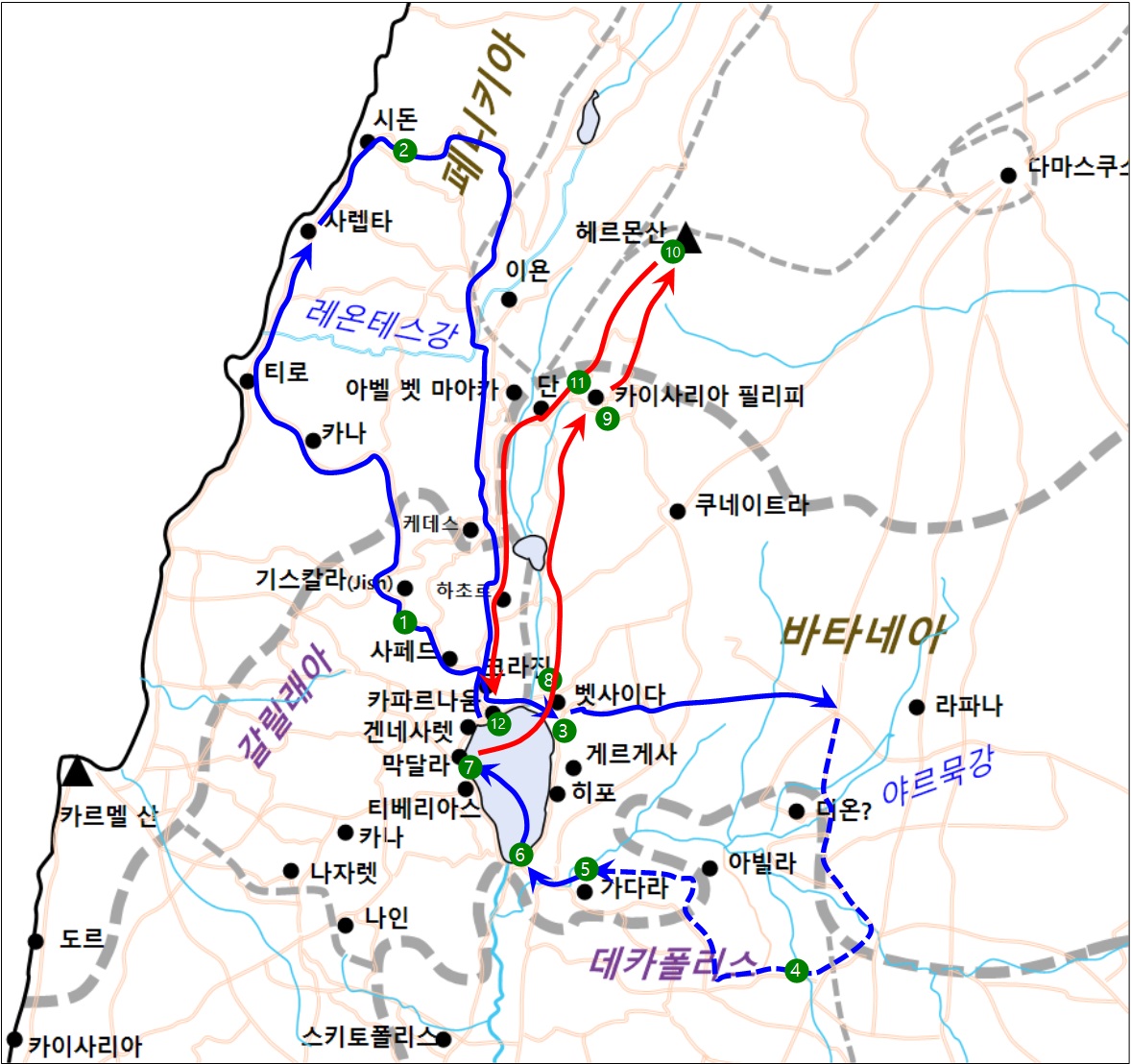 ▶예수님의 티로, 시돈, 데카폴리스 지역 여정 지도