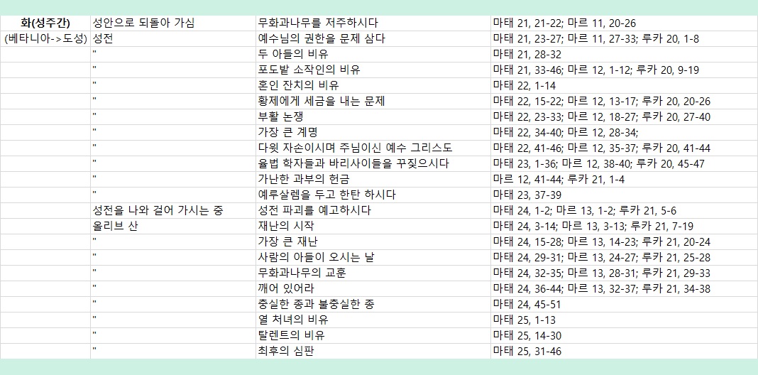 | ① 예수님께서 화요일 아침에 베타니아를 출발하신다(마르 11, 20ㄱ). ② 제자들이 예수님께서 저주한 무화과나무가 말라있는 것을 발견한다(마르 11, 20ㄴ) ③ 예수님께서 성전에 도착하신다(마르 11, 27). ▷ 사제들이 성전 정화를 하신 예수님의 권한에 대해 질문한다(마태 21, 23; 마르 11, 28; 루카 20, 1) ▷ 예수님께서 성전에서 가르치신다: 두아들(마태 21, 28). 포도밭 소작인(마태 21, 33), 혼인 잔치(마태 22, 1) ▷ 바리사이들과 헤로데 당원들이 황제에게 세금을 내는 문제로 예수님께 올가미를 씌우려 한다(마태 22, 15) ▷ 사두가이들이 부활 논쟁을 일으킨다(마태 22, 23) ▷ 바리사이들이 예수님께 가장 큰 계명이 우엇인지 질문한다(마태 22, 34) ▷ 바리사이들이 메시아가 누구의 아들인지 묻는다(마태 22, 41) ▷ 예수님께서 율법 학자들과 바리사이들을 꾸짖으신다(마태 23, 1-36) ▷ 예수님께서 동전 두닢을 넣는 가난한 과부를 보신다(마르 12, 41; 루카 21, 1-4) ④ 예수님께서 성전에서 나와 걸어가시는데 제자들이 성전 건물을 보고 이야기 한다(마태 24, 1) ⑤ 예수님께서 올리브 산에 앉아 계실 때 제자들이 다가와 성전 파괴, 재림과 종말에 대해 묻는다(마태 24, 3). ▷ 예수님꼐서는 마태 23장과 24장, 마르 11장 그리고 루카 20장과 21장에서 대답하신다. |