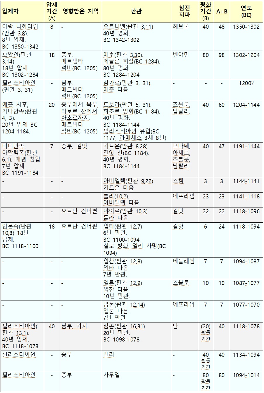 판관기 연대표 해설 판관기의 판관 활동 연대는 고고학적 성경 연대로 BC 1350년부터 BC 1070년까지 280년이다. 그런데 판관기에 나온 압제 기관과 판관의 활동 기간을 순차적으로 전부 합산하면 389