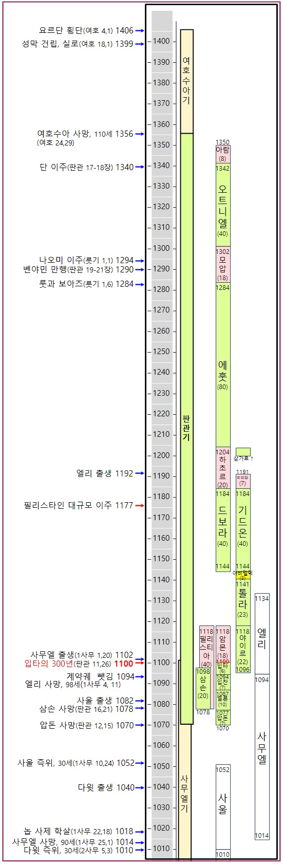 | 입타에서 입찬으로 바뀌는 시기에 실로가 필리스티아인들에 의해 파괴되고 계약궤를 탈취당한다. 이로인해 엘리가 사망하고 사무엘이 그 뒤를 이은다(1사무 4,1-18). 이 시기에 삼손이 나오지만, 여자 문제로 하느님의 뜻을 받들지 못하고 필리스티아인들의 손에 죽게 된다. 이처럼 판관들과 관련된 당시 시대 상황의 변화로 이스라엘 민족은 하늘의 임금이신 하느님이 아닌 땅의 임금인 사람을 원하게 된다. 이에 대한 내용은 사무엘기에 나온다. |