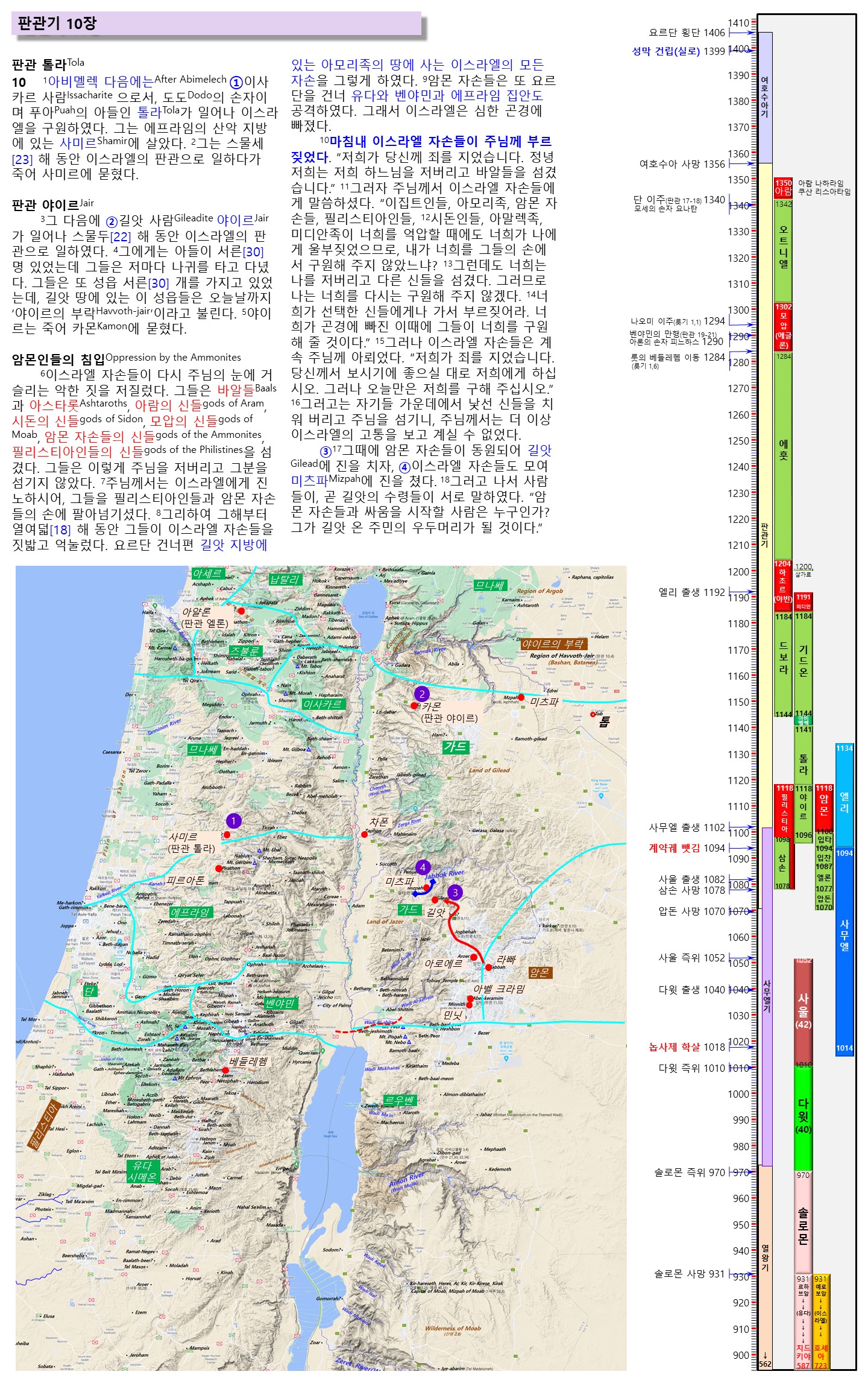 | 가나안 땅에 있는 유다, 벤야민 그리고 에프라임을 공격했던 암몬 자손들이 자신감을 얻고 길앗 지방을 공격하려 한다. 특히 이스라엘 남부에서는 필리스티아인들이 유다인들을 억압하고 있었기 때문에 이스라엘의 세력이 약화되었다. 암몬으로는 좋은 기회였다. |
