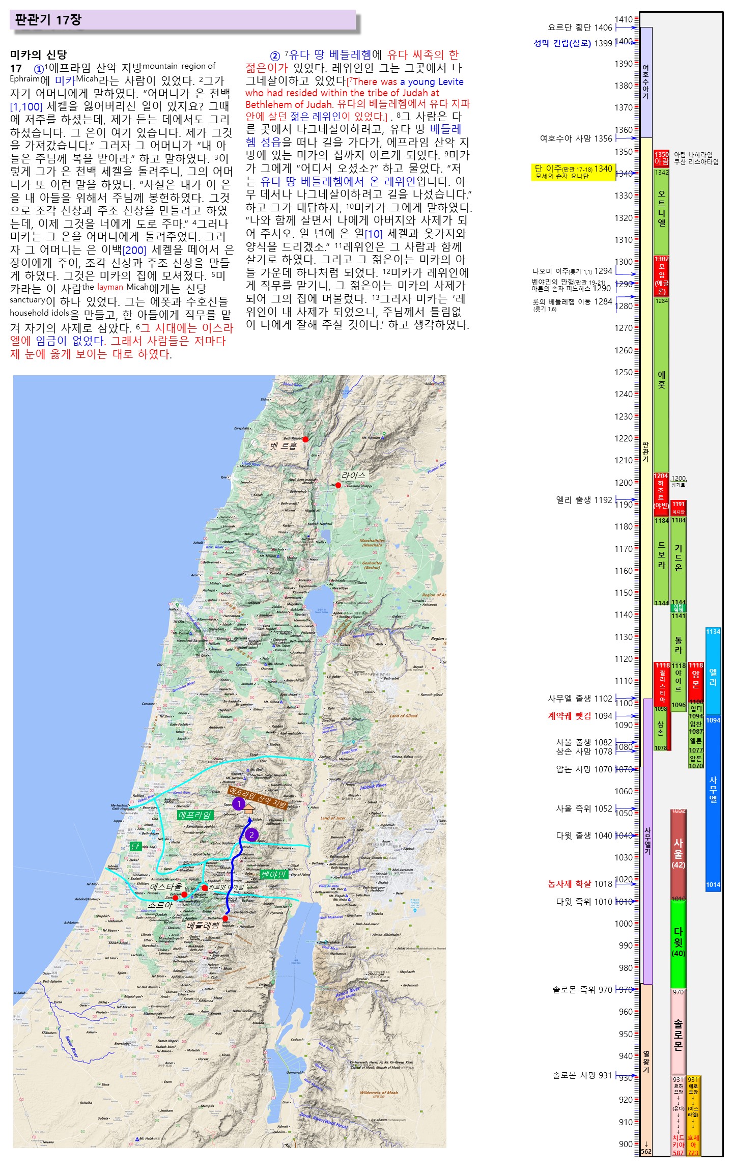 | 판관기 17-18장은 판관기의 뒷부분에 위치하지만, 그 시기는 판관기 초반에 해당한다. 판관기에서 "모세의 손자이며 게르솜의 아들인 요나탄과 그의 자손들이 단 지파의 사제로 일하였다."(판관 18,30) 라고 밝히고 있기 때문이다. |