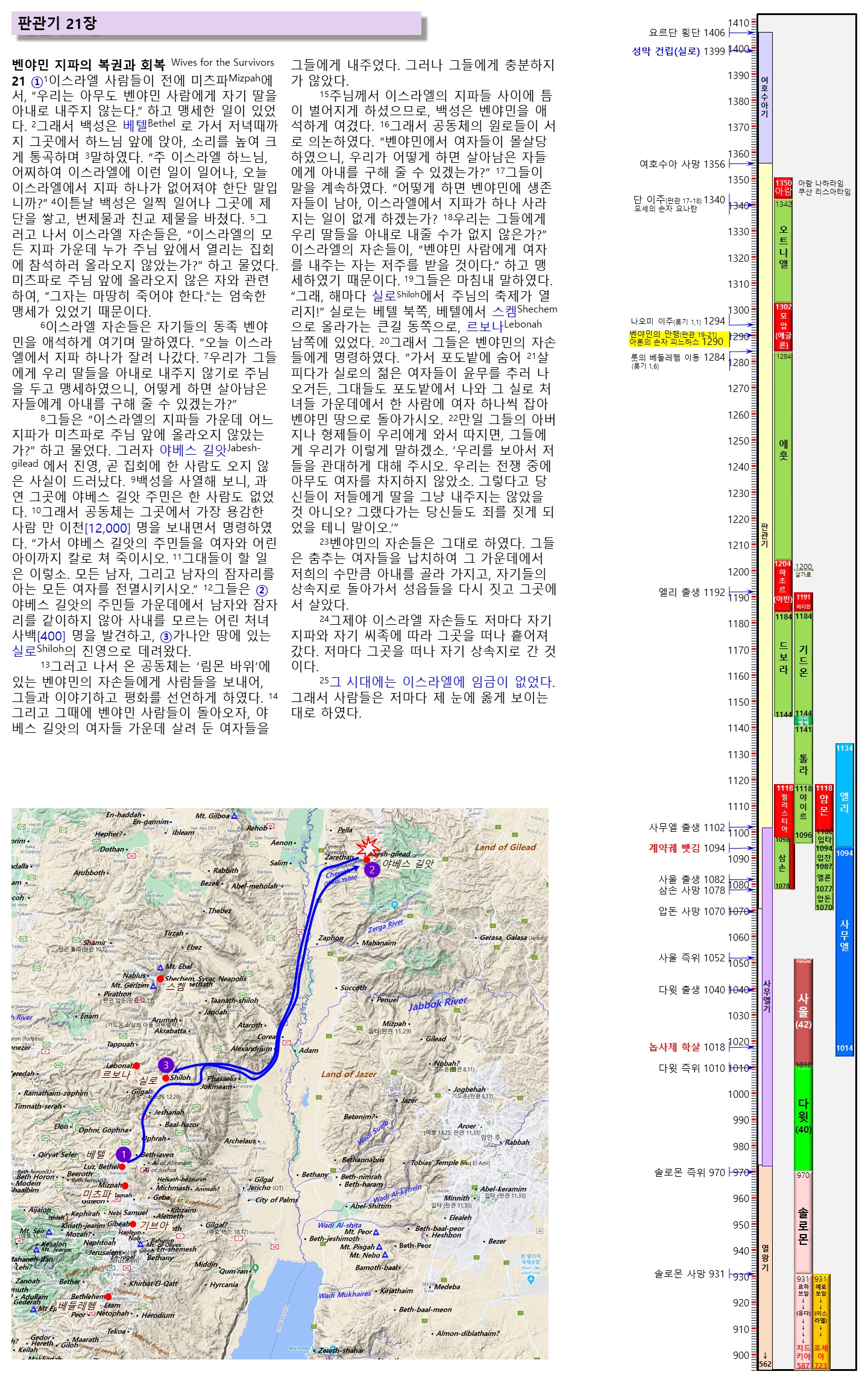 11) 이스라엘이 야베스 길앗을 공격하고 어린 처녀 400명을 데려와 벤야민 지파에게 내주다.