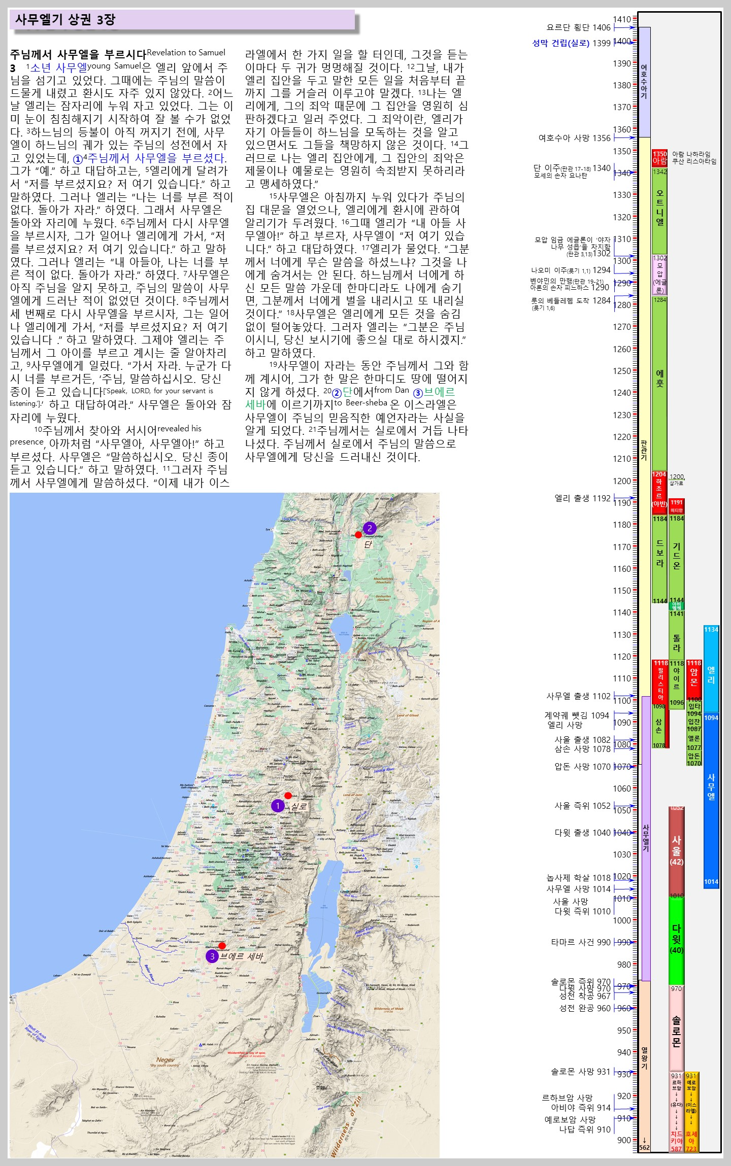 | 사무엘 시대에, 주님께서는 실로에 계신다. 하지만 에프라임 지파의 지역에 있는 이스라엘의 중심 성소인 실로는 이스라엘 자신들의 죄로 인해 성소로서의 기능을 영원히 잃게 될 것이다. |