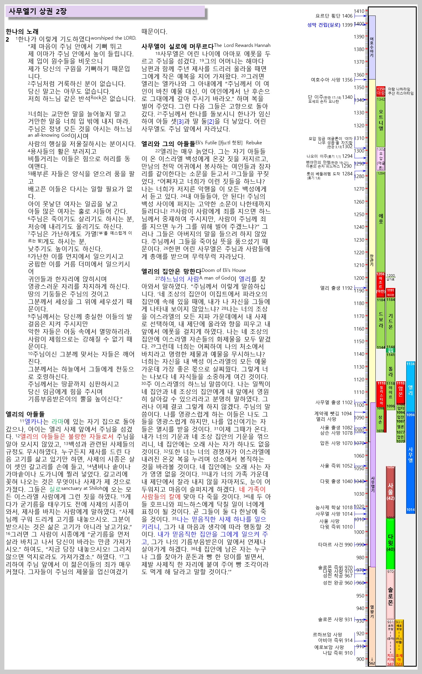 | [1사무 2,27-36 주석] 엘리의 집안은 망한다(1사무 2,27-36). 이들 구절은 요시야의 개혁과 동시대의 관점에서 엘리의 처벌을 기술한다(2열왕 23,9; 비교 36절). 그 내용들은 1사무 22,18-23(사울의 놉의 사제들 학살)과 1열왕 2,27에 기록된 사건들에서 암시한다. 이 하느님의 경고에 대한 더 오래된 이야기는 1사무 3,11-14에 나온다. |
