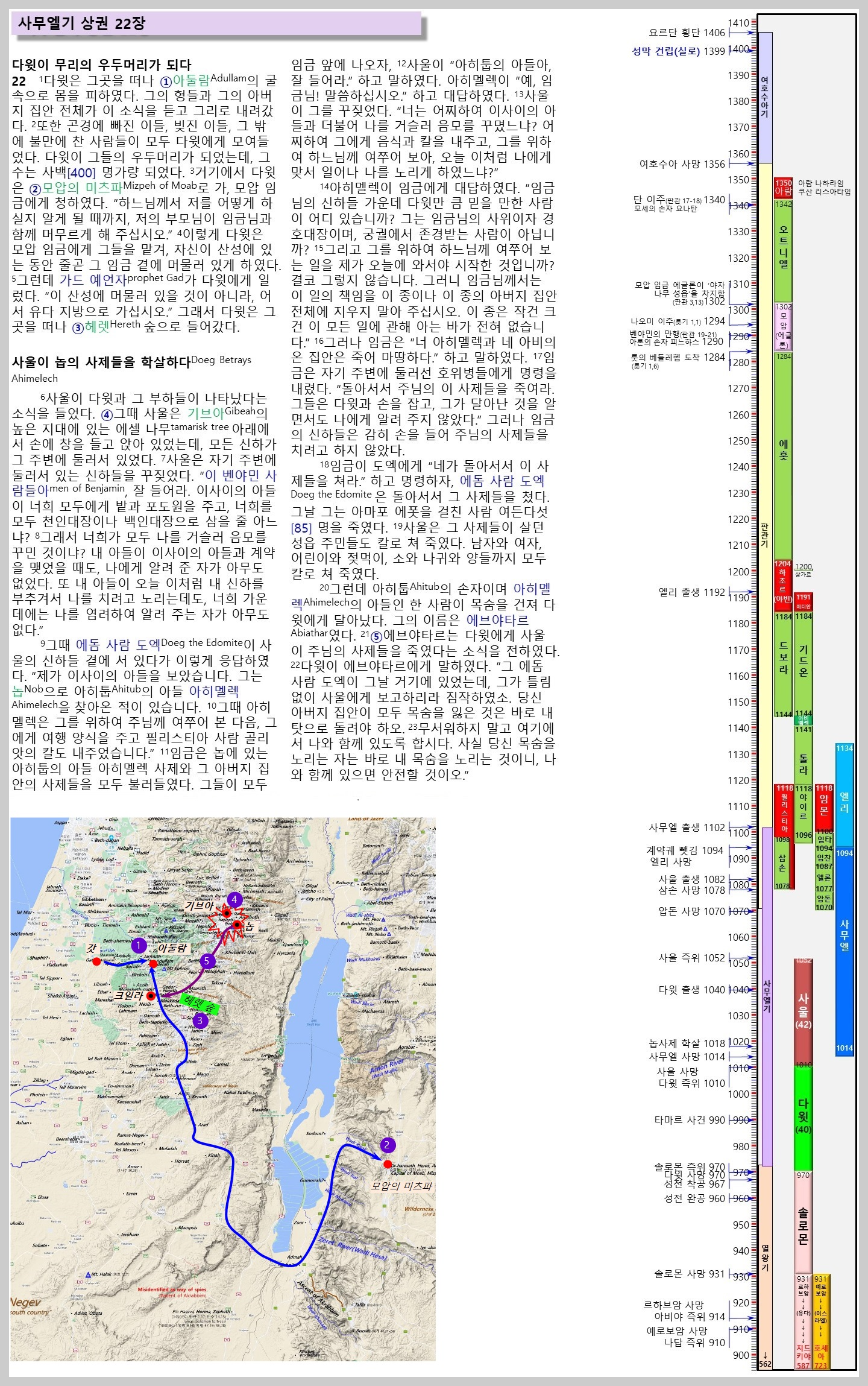 | <목차> I. 다윗의 유다 광야 피신 1. 다윗이 아둘람의 굴 속으로 피하다. 2. 다윗이 모압의 미츠파로 가다. 3. 가드 예언자가 다윗에게 유다 지방으로 가라 하다. II. 사울의 놉 사제 학살 1. 다윗이 나타났다는 소식을 듣고 사울이 화를 내다. 2. 에돔 사람 도엑이 아히멜렉을 배신하다. 3. 아히멜렉이 사울에게 자신의 무고함을 항변하다. 4. 사울이 도엑에게 놉 사제들을 죽이라고 명령하다. 5. 에브야타르 사제가 다윗에게 사울이 주님의 사제들을 죽였다는 소식을 전하다. III. 엘리 가문 사제들의 학살당한 이유와 운명 1. 네 집안을 선택해서 모든 것을 맡겼다. 2. 너희는 나를 무시하였다. 3. 너희는 멸시를 받을 것이다. 4. 네 조상 집안의 기운이 꺾일 것이다. 5. 나머지는 칼에 맞아 죽을 것이다. 6. 살아 남은 자는 사제직 한 자리에라도 붙여 달라고 할 것이다. |