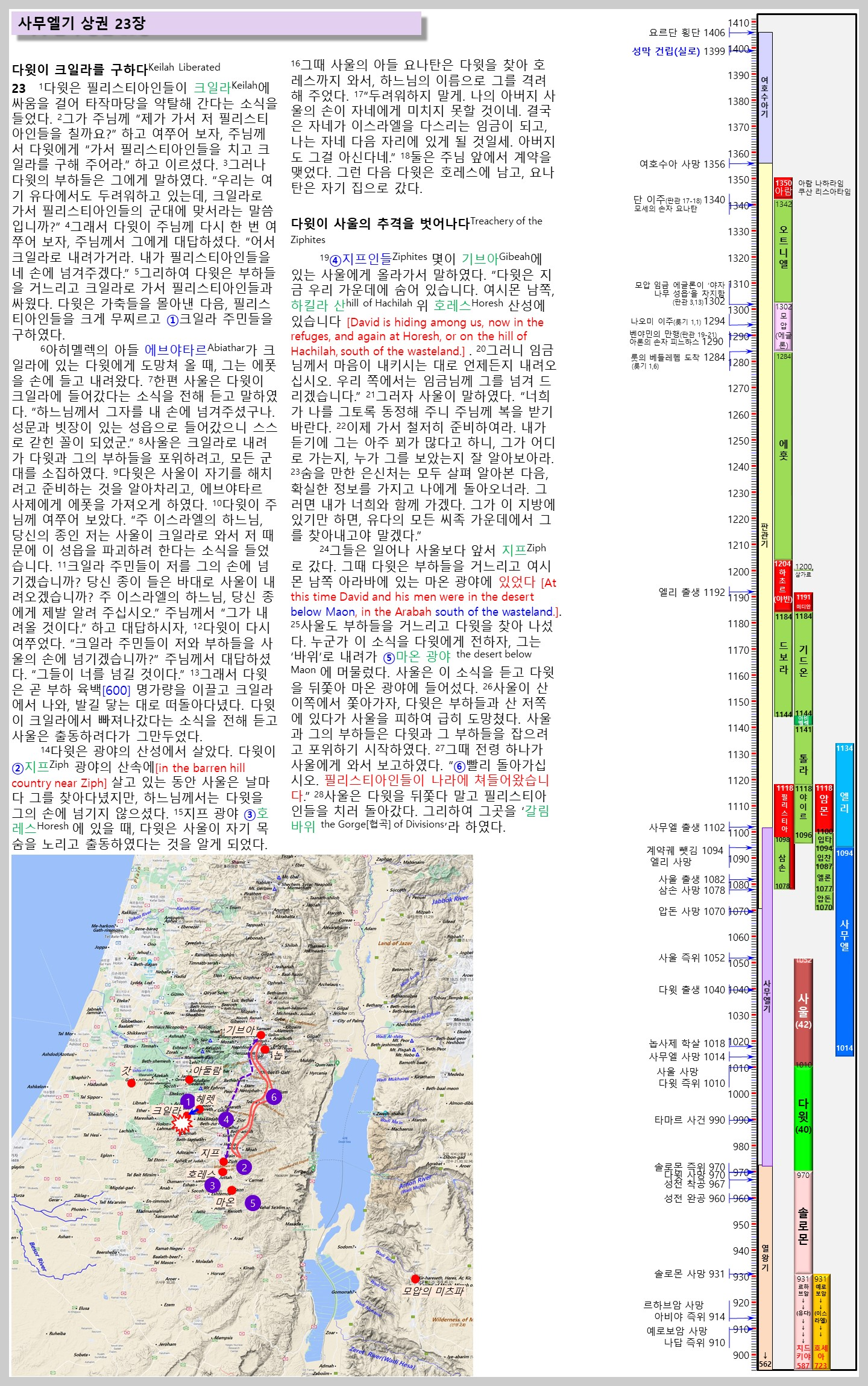 | <목차> 1. 다윗이 크일라를 구하다. 2. 에브야타르가 다윗을 찾아 놉에서 크일라로 도망쳐 오다. 3. 사울이 군대를 소집하다. 사울의 착각. 4. 다윗이 크일라를 나오다. 5. 다윗이 지프 광야의 산속에 살다. 6. 다윗이 지프 광야 호레스로 가다. 7. 지프인들이 다윗을 사울에게 밀고하다. 8. 다윗이 마온 광야로 가다. 9. 사울이 다윗을 뒤쫓아 마온 광야에 들어서다. 10. 사울이 필리스티아의 침공 소식을 듣고 물러나다. |