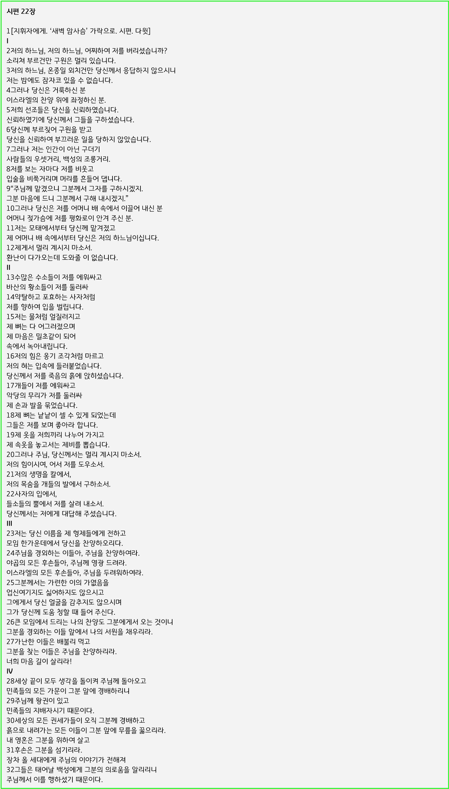 저의 하느님, 저의 하느님 다윗 시편. 구조와 감정의 강렬함에서 특이한 시편이다. 시편 저자의 현재 고난은 시편 22,2-12에 나오는 하느님께서 베푸신 과거의 자비와 대조된다. 시편 22,13-22에서