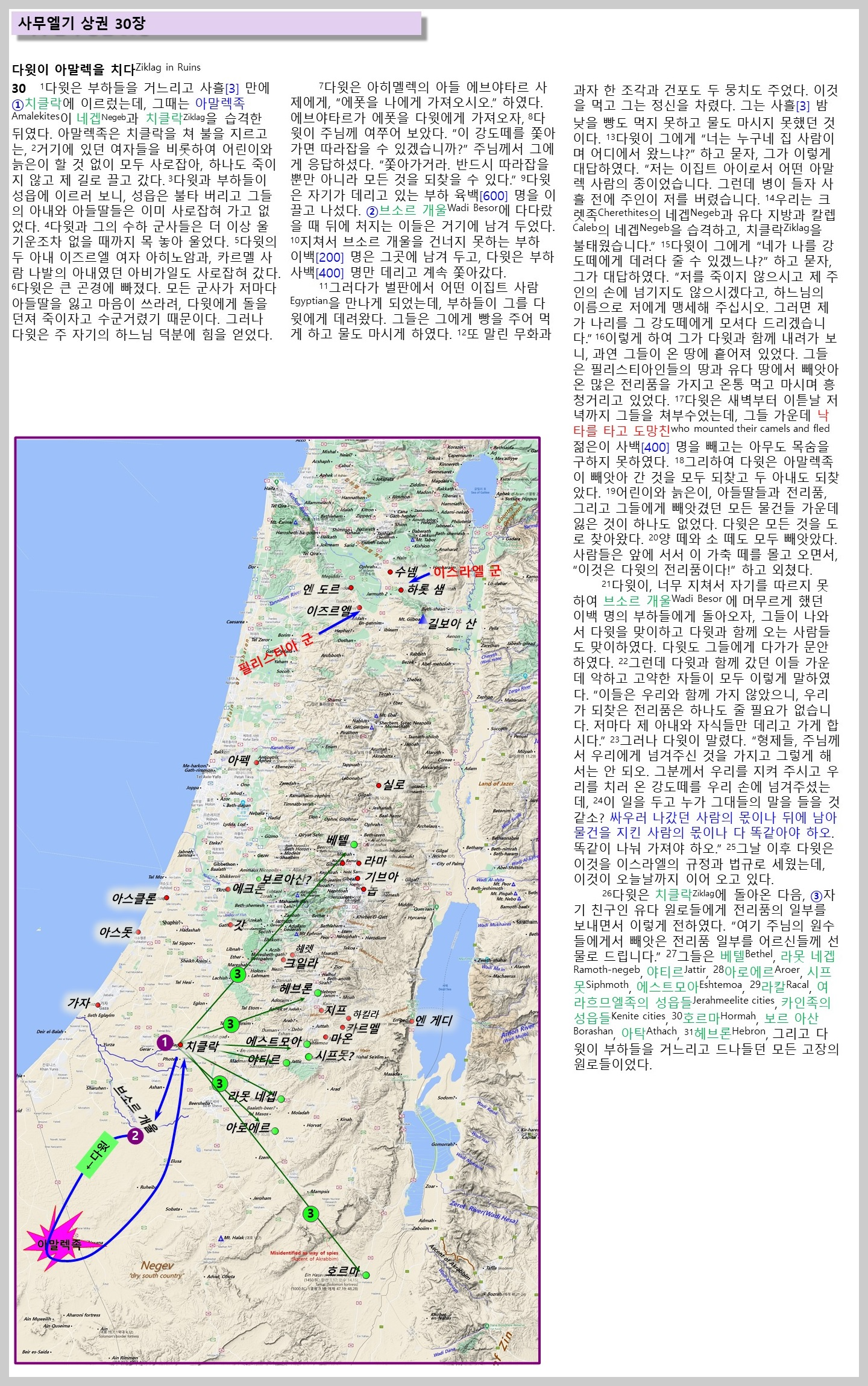 | <목차> 1. 필리스티아는 아펙에, 이스라엘은 이즈르엘 하롯 샘가에 진을 치다. 2. 다윗이 전투에서 배제되다. 3. 다윗이 아말렉족의 공격을 받은 치클락에 도착하다. 4. 다윗이 브소르 개울에 다다르다. 5. 다윗이 브소르 개울을 건너 아말렉을 추적하다. 6. 다윗이 아말렉족을 쳐부수다. 7. 다윗이 브소르 개울로 돌아 오다. 8. 다윗이 유다 원로들에게 전리품 일부를 선물로 보내다. |