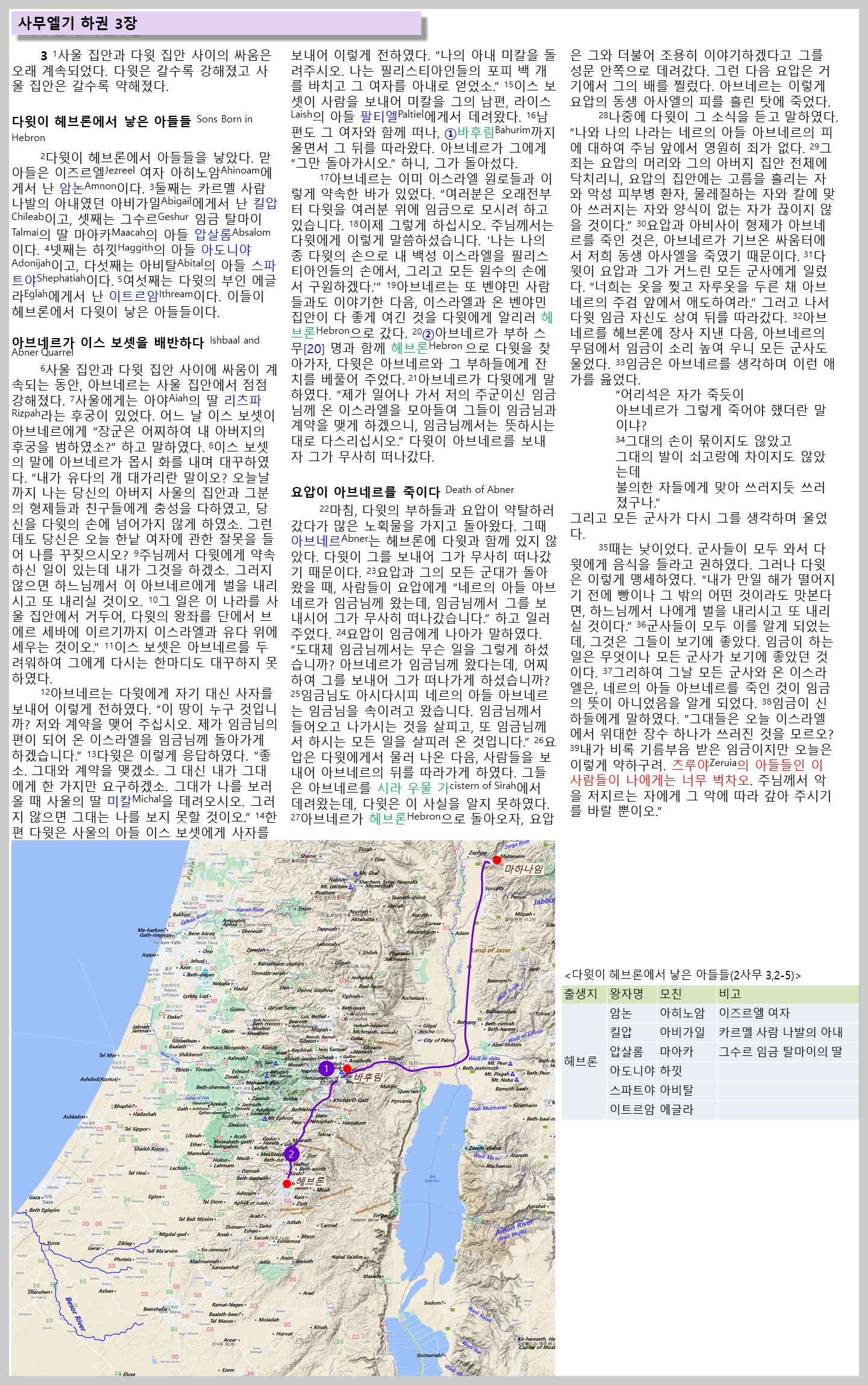 1. 다윗이 온 이스라엘의 임금이 되다(BC 1003년)더보기3그리하여 이스라엘의 원로들이 모두 헤브론으로 임금을 찾아가자, 다윗 임금은 헤브론에서 주님 앞으로 나아가 그들과 계약을 맺었다. 그