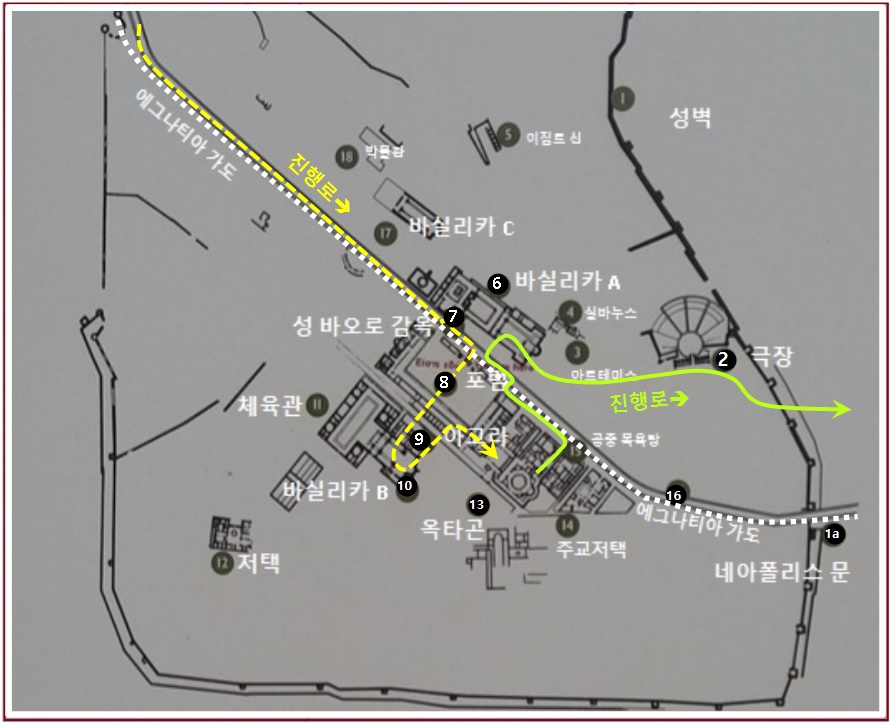 바실리카 A를 나와 에크나티아 가도를 지나 사도 바오로의 옥타곤 바실리카로 간다.