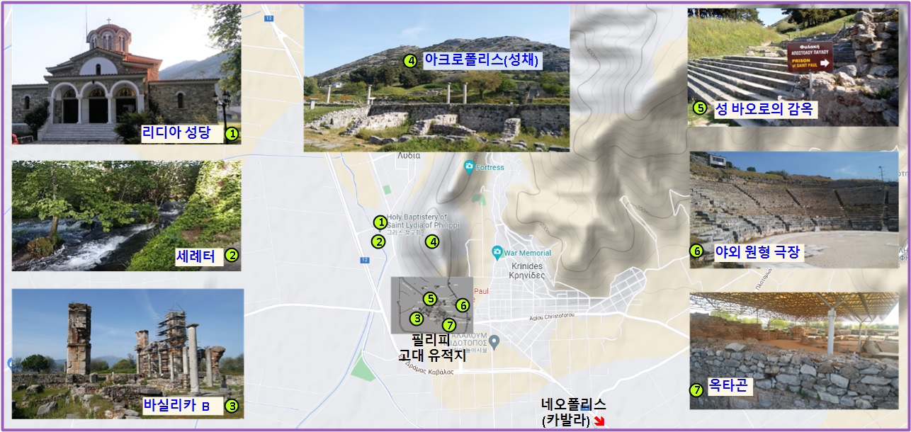 필리피의 위치와 주요 지명 및 유적지 시설명은 아래와 같다.