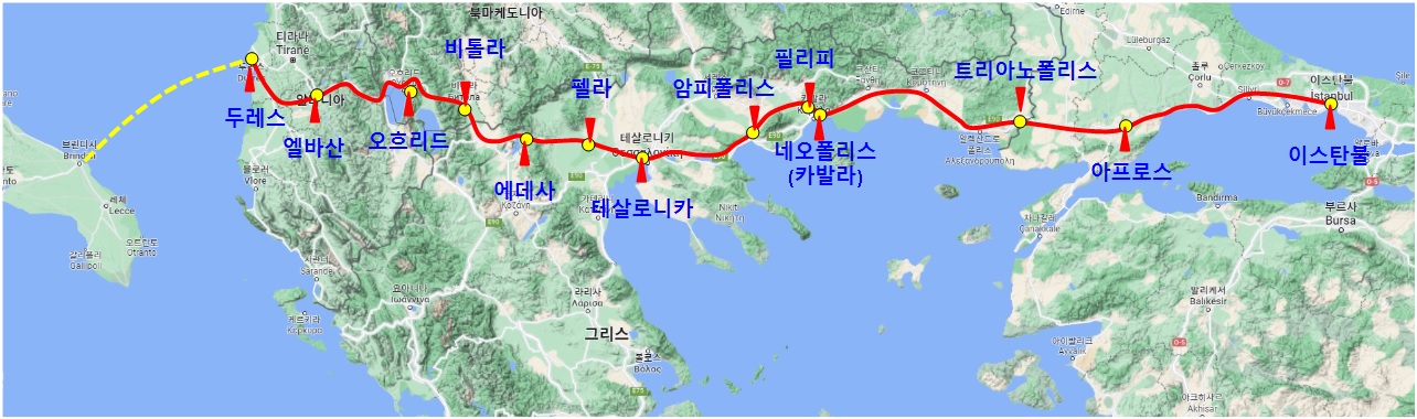에그나티아 가도는 이스탄불 → 카발라(네아폴리스) → 필리피 → 암피폴리 → 테살로니카 → 펠라 → 에데사 →듀레스로 이어지는 고대 로마 도로이다. 이 도로는 바다 건너 이탈리아의 아피아 가도로 연결된다.